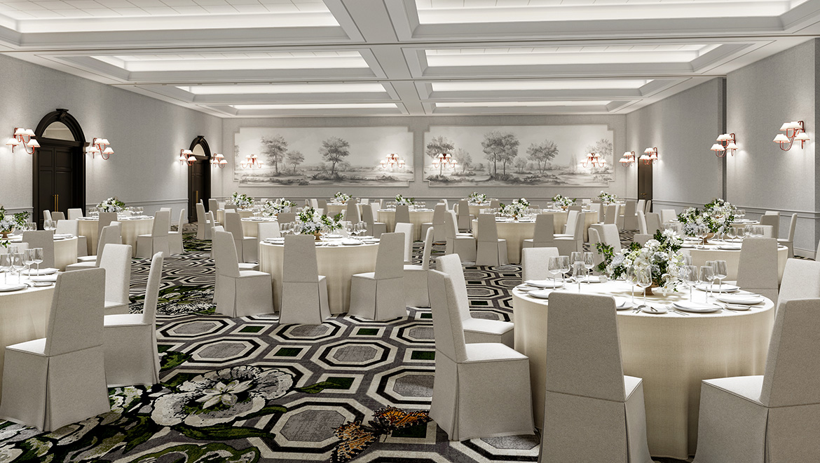 Statement seating thoughtfully arranged into four conversation areas will create a refined, yet welcoming sense of arrival. Time-honored design elements such as brick columns, archways and black and white tile floors along with classic wood accents will enhance the registration area.