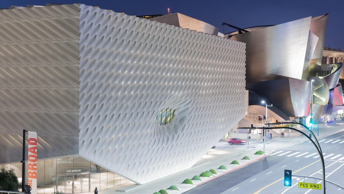 The Broad, with its unique “veil and vault” concept, was designed by world-renowned architecture firm Diller Scofidio + Renfro (DS+R) in collaboration with Gensler. The museum sits on Grand Avenue and neighbors Frank Gehry’s iconic Walt Disney Concert Hall, MOCA, the Los Angeles Music Center, Mark Taper Forum, Ahmanson Theater and the Dorothy Chandler Pavilion.